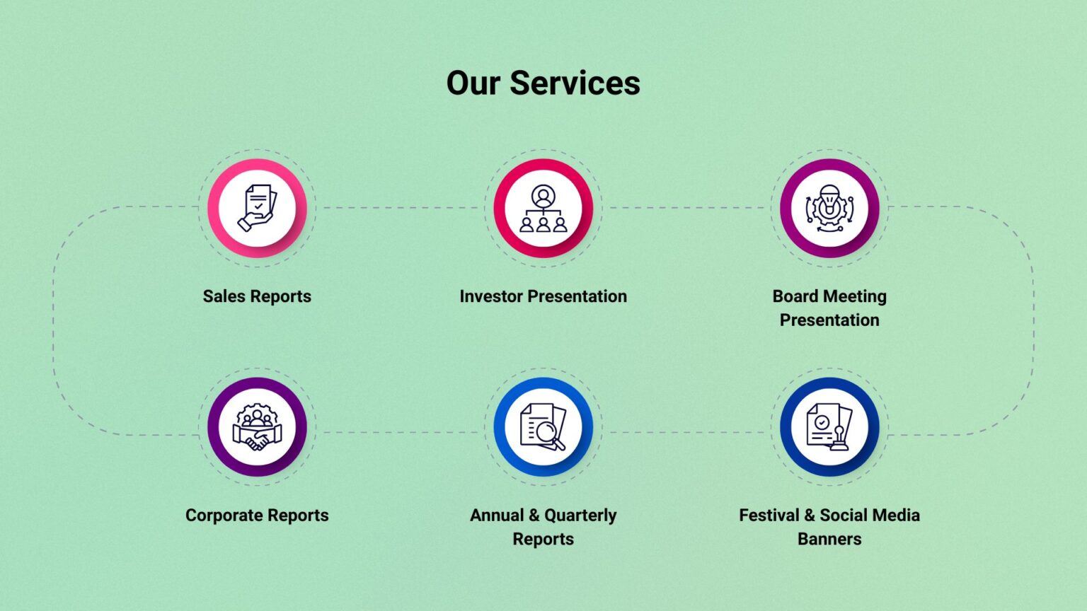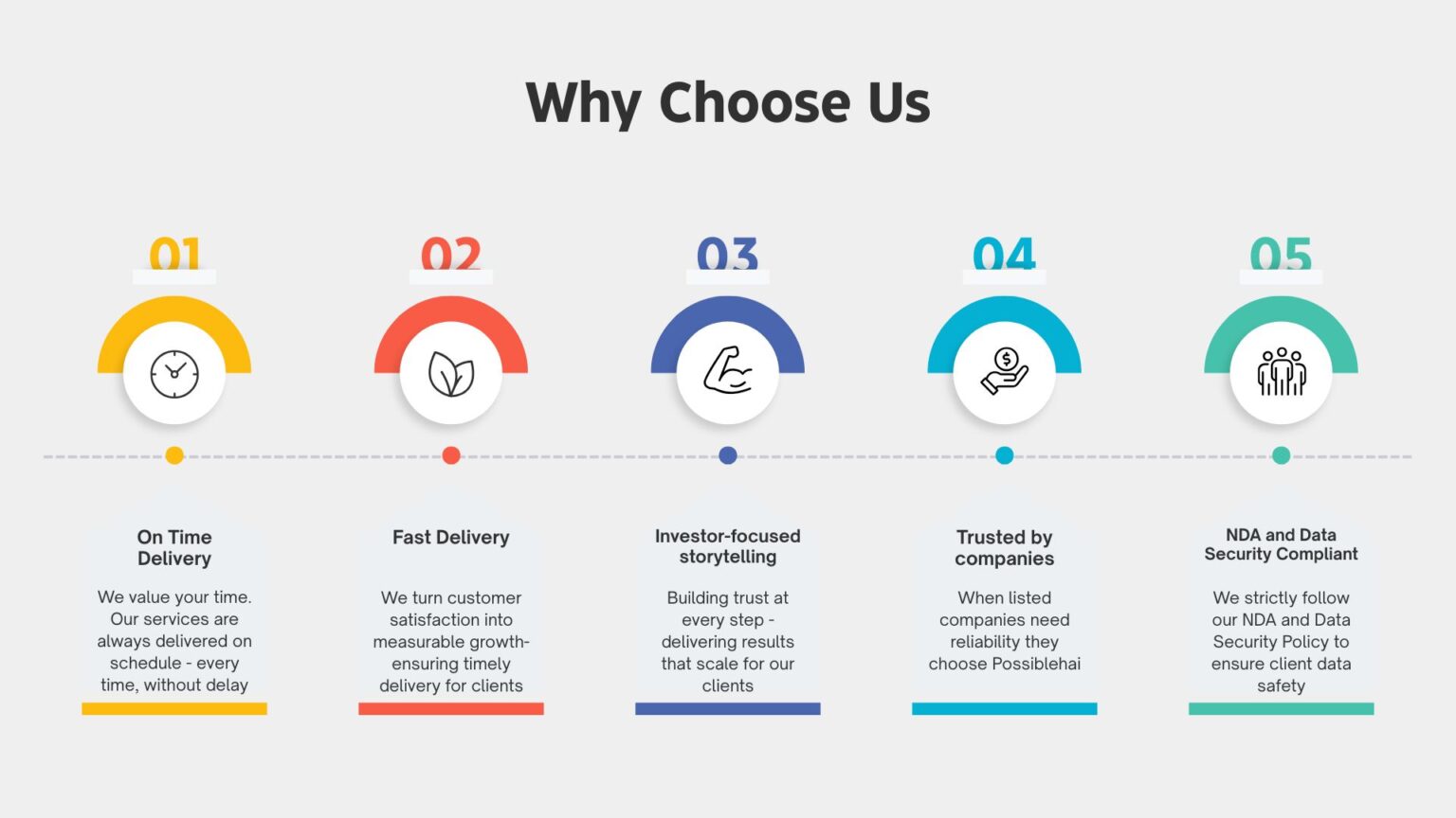 Our mission is to transform complex corporate data and strategic narratives into stunning, easy-to-digest visual content. We aim to simplify communication for listed companies by providing design excellence across all critical formats—from Investor Presentations and Corporate Reports to engaging Social Media Graphics. We are committed to helping our clients deliver their message with maximum clarity and impact, ultimately driving trust and stakeholder confidence.